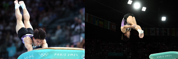 Carlos Yulo during artistic gymnastics men's vault final during the Paris 2024 Olympic Game. Source: ABS CBN Sports News (left) & The Guardian News (right)