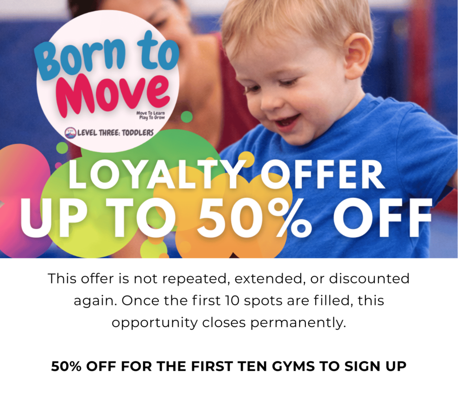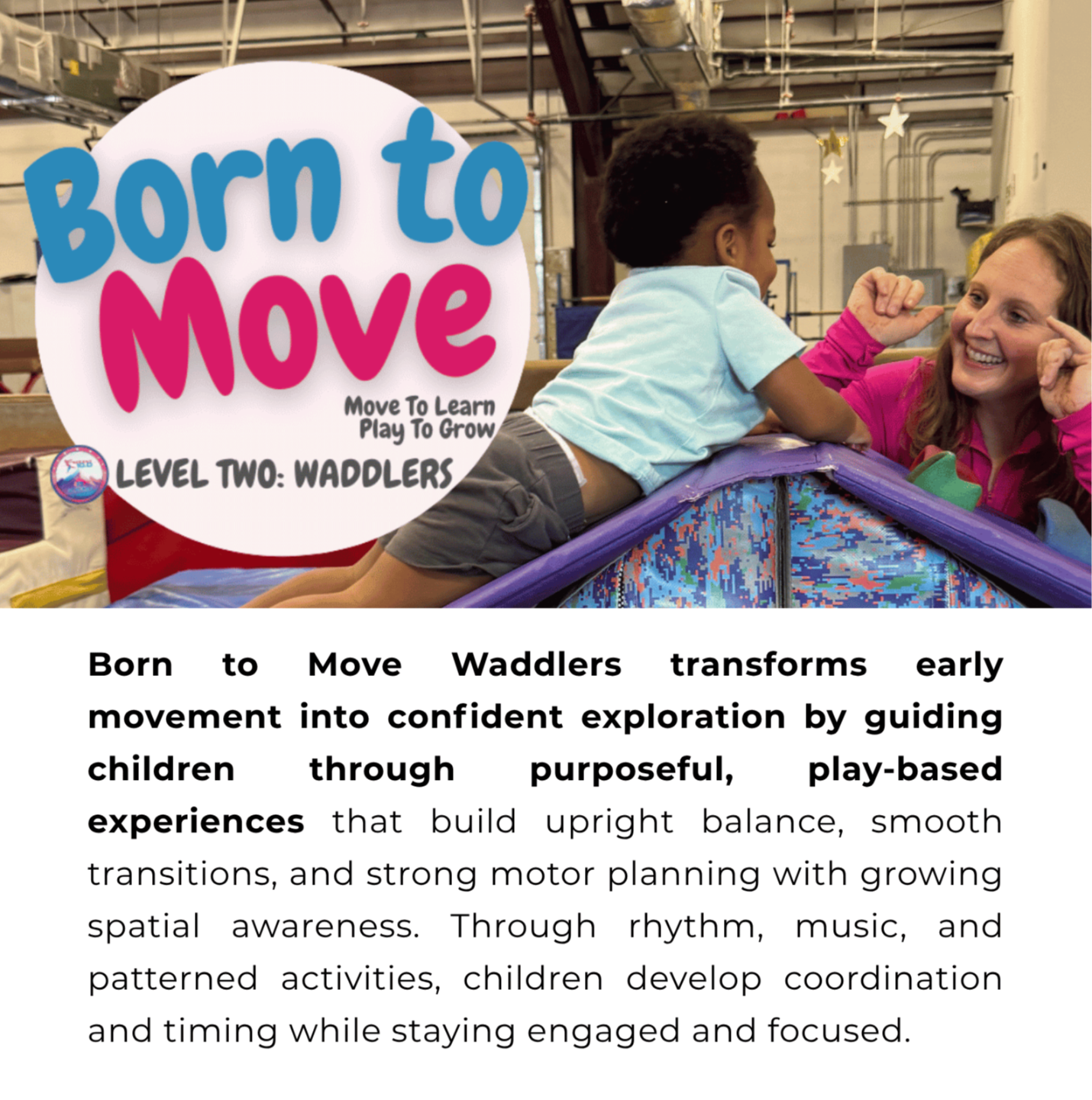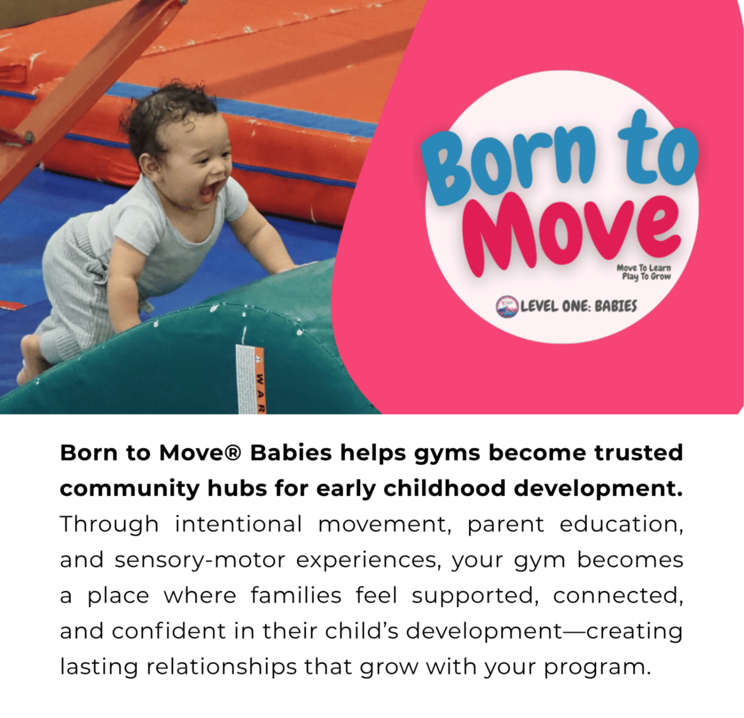 The Born to Move® Series is a developmentally sequenced, neuroscience‑informed movement curriculum designed for ages 3 months–5 years, giving gyms, coaches, and families a clear pathway to support regulation, confidence, coordination, and lifelong love of movement.